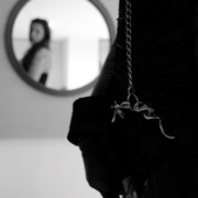 Entraron a la habitación, tenía una cama tamaño King iluminada por una cálida luz roja trasera, ubicada sobre el panel también rojo que adornaba la cama, un pequeño sofá rojo de cuero acompañaba la decoración junto a una mesita central, el baño contaba con una amplia ducha, suficiente para unas 5 personas. Al ingresar, pidieron a Helena que se quitara la ropa y en su lugar usara un traje negro de licra, escotado en pecho y espalda, cerrado alrededor del cuello, con un collar de cuero negro encintado en él – el traje terminaba en forma de body, dejando libres y visibles las piernas blancas y tatuadas de Helena – Una vez se puso el traje, vendaron sus ojos y amarraron sus manos detrás de la espalda con esposas.